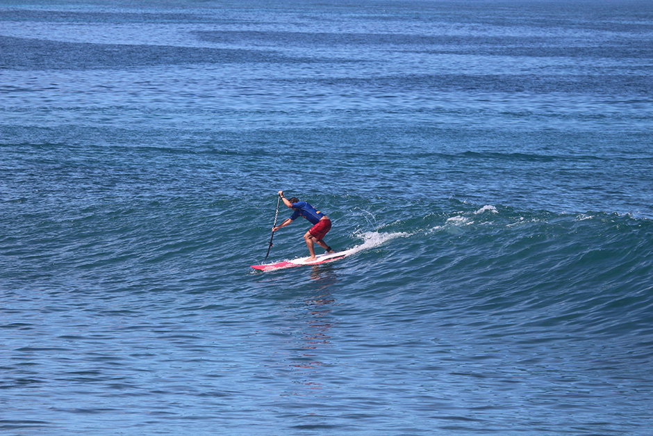 Keep an eye on the wave and on the area directly in front of you and using short, rapid stokes try to have the board pointing directly to the shore and down the wave as it reaches you. You will feel the tail of the board rise and a sudden burst of acceleration as the wave face becomes more vertical and gravity causes the board to start to drop down the wave. Compress your stance, look where you are going and enjoy the ride. You are SUP surfing!