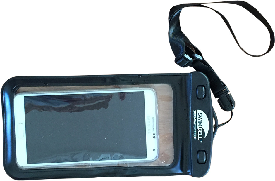 We have also used a waterproof speaker (that secures to our touring SUP) on flat water sojourns. This works from our smartphone via Bluetooth but only has so much range. SwimCell’s waterproof pouch is the perfect solution for this scenario.