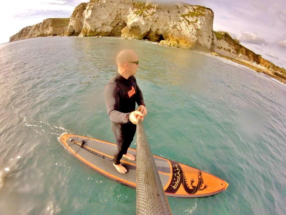 There are plenty of spots for putting SUP style in all around the IOW but it was Freshwater Bay that held most appeal for us. Why? Because of the coastline topography you find here. Fresh is predominantly a reefy location with sheer cliffs flanking either end. Gin clear water makes for some fab seabed gazing but it’s the iconic rock stack formation on the eastern side that gives Freshwater its distinct feel. There’s beach at low tide which is good for family sand castles and sundown beers while round the headland to the west offers paddles some awe-inspiring deep water views complete with white cliff framing.