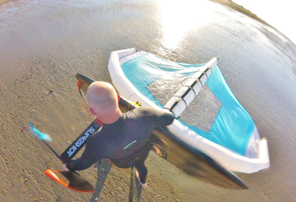 As we move forwards and learn about wings it’s pretty apparent that in light air mode atop just a SUP, without foil, you’ll need an increased centre of lateral resistance, such as a centre board or centre fin (as well as standard fins), to aid upwind tracking. With skill it’s possible to use the board’s rails but most SUPers won’t be coming at this from a windy background. You also need enough grunt to balance the rider in question – give he/she something to lean against. Where V1 was applicable to 18 knots we found with McConks’ GoFly 5m V4 you can drop this a tad to a consistent 15 knots. If foiling is your thing then you might get away with 12 knots with good technique.