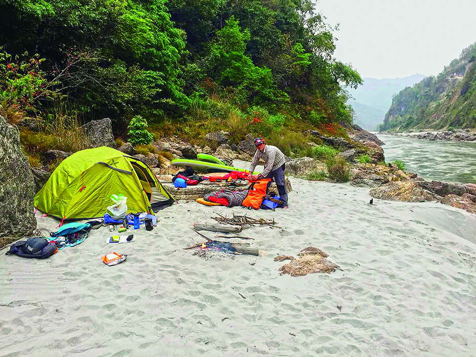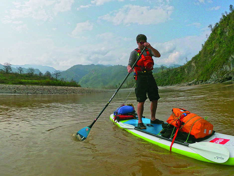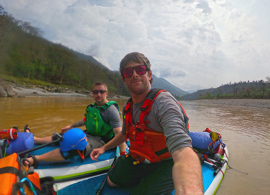 Five months, several hundred texts, several re-packs of our bags, and one paddle board session later it was time for Nepal. On a breezy April afternoon we were dropped by a taxi next to the river in the village of Ramdi. We spread our kit on the beach and pumped up our inflatable 13-foot paddle boards. Organisation was sacrificed at the altar of excitement and we stuffed our bags haphazardly with food, tents, sleeping bags and everything else before strapping them to the boards.