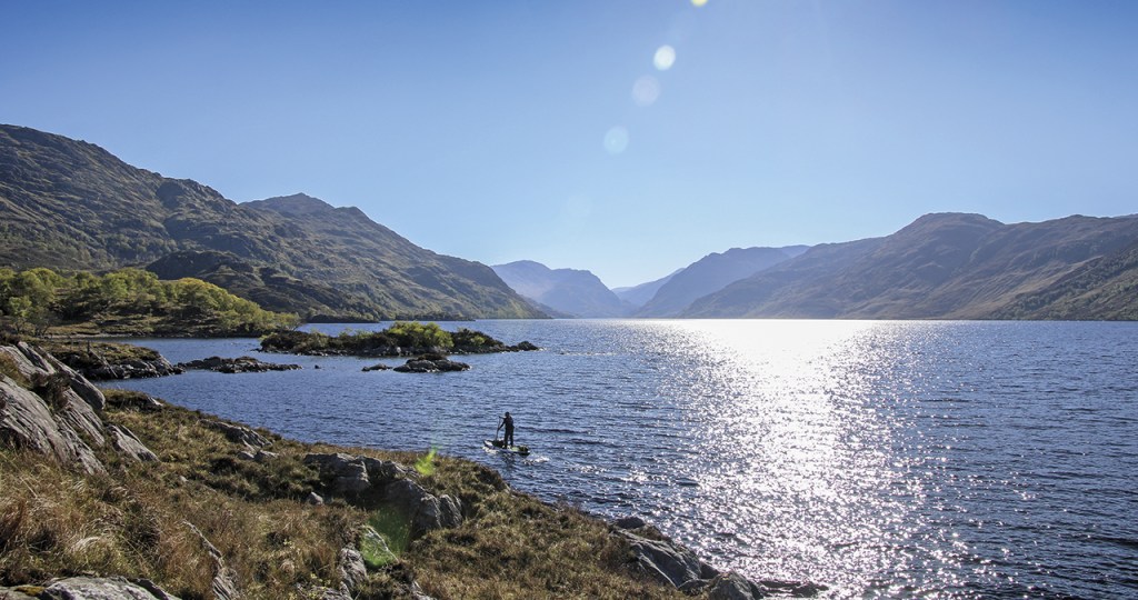Boards inflated, shuttle completed, food issued, sun cream on, we sat on the banks of a crystal clear loch – only a light breeze providing a slight change to its texture. Welcome to the west coast of Scotland our number one favourite place in the world! For the next four days we are going to travel into one of the remotest places in the UK. After months of planning we begin our pre-trip brief. Checks completed, questions answered and some laughs to send us on our way we dipped our paddles into the fresh water and began a very special journey.