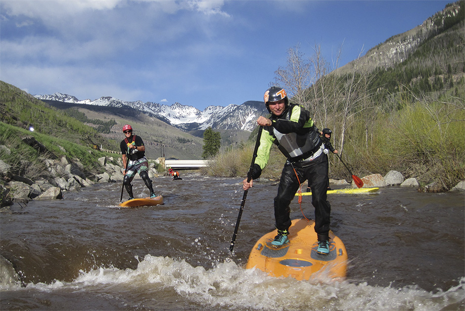 However, evidence in favour of my embarrassing oversight is overwhelming. I was an ex-pro kayaker, living in a wonderland of river waves, teaching surfing every day on those waves, and I never made the link to try to add a paddle to the mix. To make matters even worse, crazy kayaker and inventor Jeff Snyder had started to run rivers standing upon an inflatable ‘Ducky’ (think one-person raft) with a two-bladed paddle in the mid-1990s. My inability to make the link is as significant as the ‘Strapped Crew’ in Hawaii not discovering tow-in-surfing until 20 years after world champion Mark Richards was pulled into Pipeline by a jet ski in front of 20 of the world’s most prominent and influential surfers.