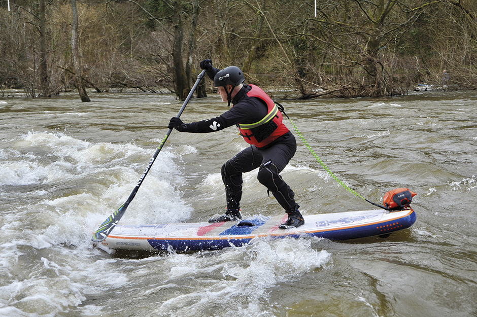It’s incredible how much time it takes to be ready; there is no point in rushing as you certainly cannot afford to forget anything. Safety of yourself and the group is paramount. Once we were kitted up, we had a safety briefing. We are all very accomplished paddlers, but these conditions were the most challenging we had been out in. We shared knowledge, safety advice, and top tips for being on the water on this day, and only when we were all happy did we set off. We had found the safest drop-in, which enabled us to get on our boards in a large calm eddy, before getting out into the fast-flowing middle lane. Anyone who has paddled the River Wye will know that it is good and wide, with sweeping bends, so although there were strainers and hazards about, they were all to the sides of the river, which meant we could give them a wide berth.