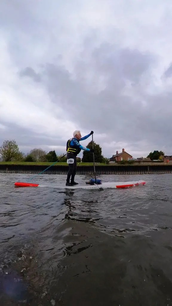 On registration, competitors (all of whom were on ISUPS) could leave a board bag to go to the finish with a change of clothes, etc. The return from Newark could be by train, with boards being transported back in vans if required. Well-managed portages occurred at five locks (involving ladder climbs and hauling boards up river embankment walls at two). I am told one of the portages was 400 metres or more. Many volunteers and water safety crews were on hand at each portage. Very reassuring. The enthusiasm and encouragement was everywhere, particularly as we all struggled with some pretty challenging conditions.