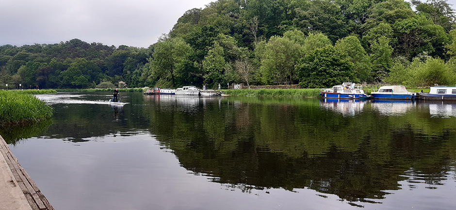 The route down river avoids weirs, and the river is navigable, so there are stretches of canal with towpaths, cyclists, walkers and friendly encouragement. Sometimes, you wonder if you have gone the right way as the canal seems interminable, dipping away from the river. “Carry right on there. It’s only a mile or two more,” is the response. “I’ve seen another fella go past ahead.” Keen followers could cover the route on mountain bikes as the towpath follows the route.