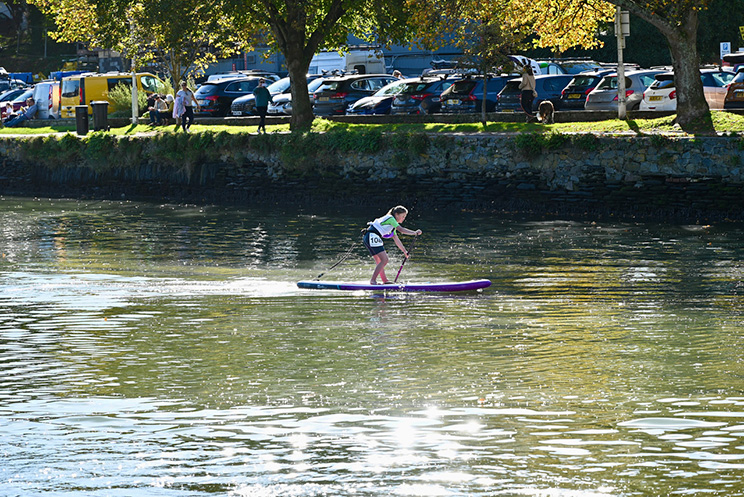 Sunday saw competitors take on an entirely different challenge with the distance races. Conditions were perfect, with light winds, clear blue skies and sunshine rivalling any ‘summer’ day! Kingsbridge was putting on a show with a classic car rally and car boot sale setting up to make the most of the fantastic forecast and our armada of SUPs on the water; there was plenty for the half-term visitors and locals alike to see in our beautiful town. With a 1km / 6km / 12km and even a 3km (prone only) course, all abilities had something to enjoy and challenge themselves with over the weekend. The fleets set off towards the town for the first race marker, which becomes somewhat of a spectacle to behold for those watching as fleet after fleet descends on the upper marker before proceeding around their remaining course.