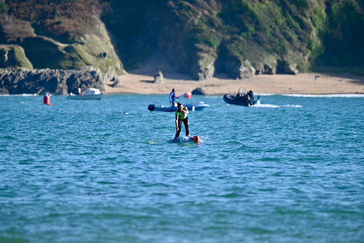 Conditions were challenging with choppy, confused water from the wind and swell driven in from Friday’s fading low-pressure system. Although some people took a dip in the sea, everyone was drenched in glorious October sunshine, and spirits were high. Thankfully, the sand ‘Bar’ was producing some waves, which competent competitors soon used to their advantage, but those less used to waves could skirt around the breaking waves to continue the course towards Sunny Cove, then in towards North Sands, then back to complete their first lap in South Sands. Competitors run with their boards up the beach through the gated area and back out for laps two and three before finishing between the flags.