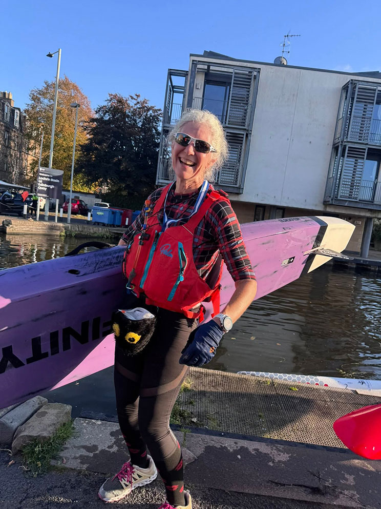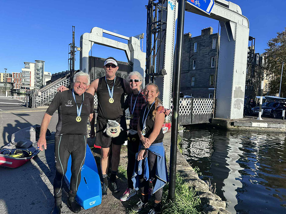 The second day was stunning, with start times chosen by the organisers to create a mass finish in Edinburgh. We left Falkirk on the Union Canal, heading after about two miles into a stunning tunnel. The next length saw us paddling through historic towns like Linlithgow, through amazing feats of engineering with the canal cut into hillsides or spanning valleys on huge aqueducts. It is strange paddling along, looking down 200 feet to the river below. The last stretch of canal on the 51km section is challenging; the water felt quite silty, and we needed to stop several times to remove weeds and gather leaves from the fins. Finally, the centre of Edinburgh arrives in view with a wonderful final stretch along parkland and streets. I was overtaken by a baby buggy propelled by a jogger and also by several speeding canoes. Alison and Alastair powered past (having set off some 5 minutes later from Falkirk), and Chris was well gone!
